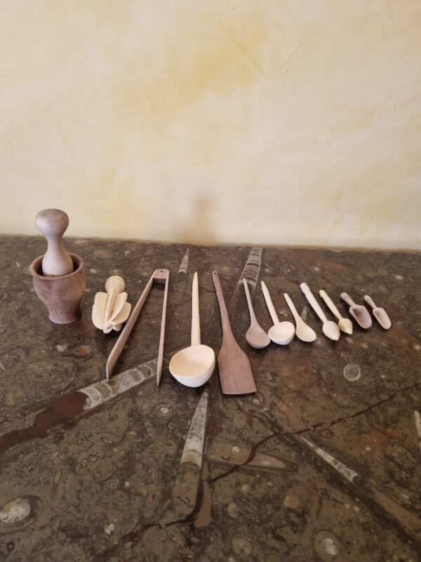 Découvrez l’artisanat marocain avec nos couverts en bois, soigneusement élaborés par nos artisans menuisiers locaux. Disponibles en différentes tailles et fabriqués en bois de noyer ou de citronnier, ces couverts incluent une variété d’ustensiles tels que des cuillères, des fourchettes, des pinces, des spatules, et bien plus encore. Parfaits pour toutes les occasions, que ce soit pour un usage quotidien, pour recevoir des invités, ou comme éléments décoratifs. Chaque couvert est une œuvre d’art unique qui apportera une touche d’élégance et d’authenticité à votre cuisine.